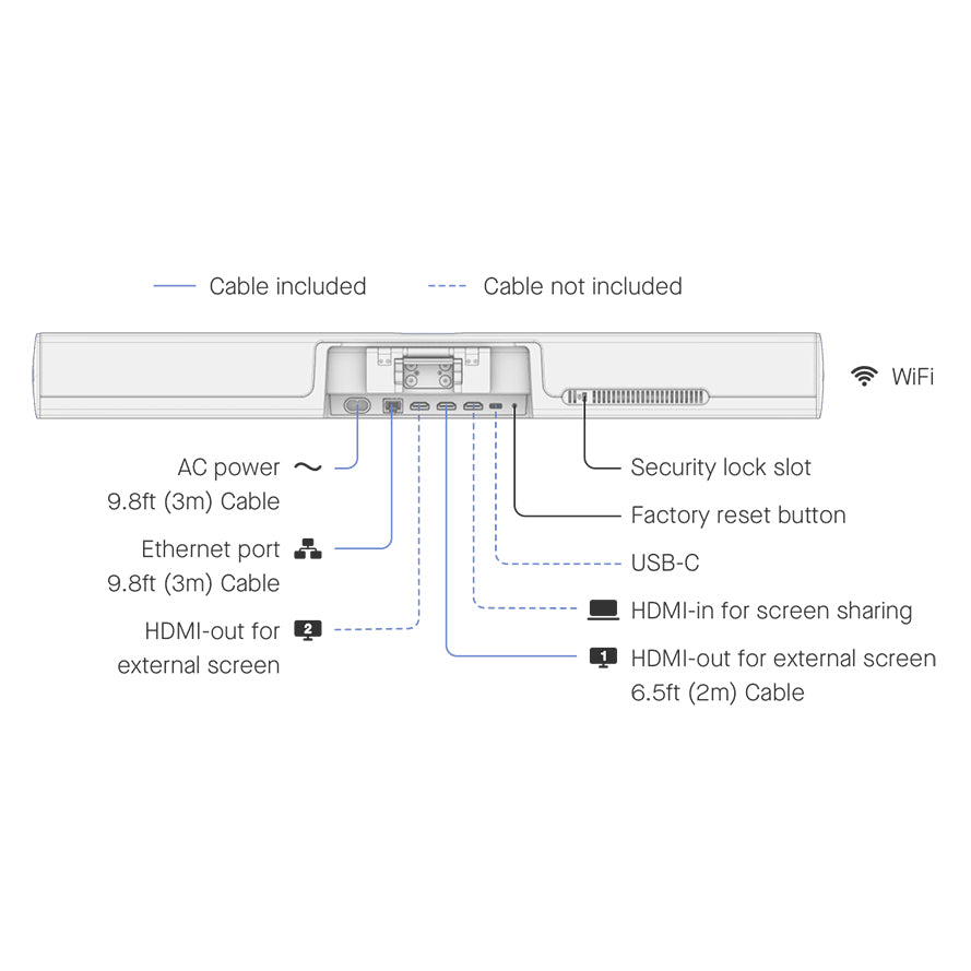 - Screen sharing is available wirelessly or via HDMI. Supports one or two screens (4K Ultra HD output supported), or can be expanded with an additional bar.